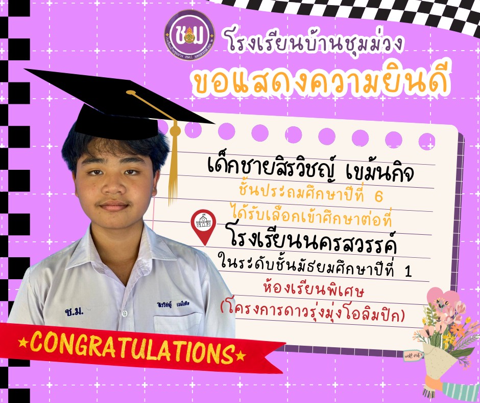 ได้รับเลือกเข้าศึกษาต่อที่โรงเรียนนครสวรรค์ ในระดับชั้นมัธยมศึกษาปีที่ 1 ห้องเรียนพิเศษ (โครงการดาวรุ่งมุ่งโอลิมปิก)